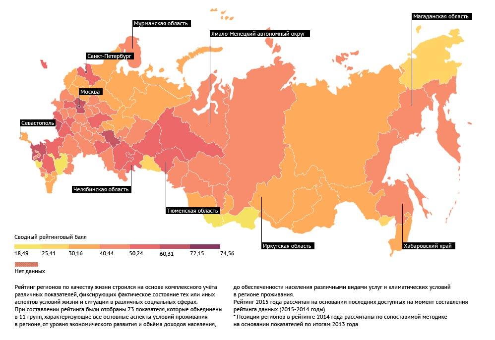 Агентство РИА Рейтинг опубликовало рейтинг качества жизни регионов России по итогам 2015 года. Впервые в этом рейтинге присутствуют два новых субъекта Федерации – Республика Крым и город Севастополь. Республика Крым с рейтинговым баллов 30,4 вошла в последнюю десятку. Севастополь расположился на пять позиций выше – на 70-м месте с рейтингом 34,19. Лидируют в рейтинге города Москва и Санкт-Петербург (76,23 и 75,63 балла соответственно). В ТОП-10 рейтинга вошли также Московская область, Татарстан, Краснодарский край, Белгородская область, Ханты-Мансийский автономный округ – Югра, Воронежская, Липецкая и Свердловская области. В десятку худших, кроме Крыма, вошли также Курганская область, Еврейская автономная область, Чукотский автономный округ, Алтай, Забайкальский край, Калмыкия, Карачаево-Черкесская Республика, Ингушетия. На последнем месте рейтинга – Республика Тыва с рейтинговым баллом 12,63. «Рейтинг регионов по качеству жизни строился на основе комплексного учёта различных показателей, фиксирующих фактическое состояние тех или иных аспектов условий жизни и ситуации в различных социальных сферах. При составлении рейтинга были отобраны 73 показателя, которые объединены в 11 групп, характеризующие все основные аспекты условий проживания в регионе, – от уровня экономического развития и объемов доходов населения до обеспеченности населения различными видами услуг и климатических условий в регионе проживания», — сообщает РИА Рейтинг. Подписывайтесь на Кафу в Facebook, страницу ВКонтакте и группу в Одноклассниках. А также на канал Youtube и Telegram. Новости по теме