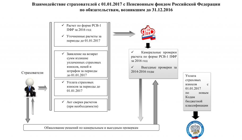 - контроль за правильностью исчисления, полнотой и своевременностью уплаты страховых взносов в ПФР и ФФОМС, подлежащих уплате за отчетные (расчетные) периоды, истекшие до 1 января 2017 г. (выездные и камеральные проверки), в порядке, установленном законодательством Российской Федерации о страховых взносах, действовавшим до 2017 года; - прием Расчетов (уточненных расчетов) по страховым взносам за отчетные (расчетные) периоды по страховым взносам, истекшие до 1 января 2017 г., в порядке, установленном законодательством Российской Федерации о страховых взносах, действующим до 2017 года; - принятие Решений о возврате сумм излишне уплаченных (взысканных) страховых взносов, пеней и штрафов за периоды до 1 января 2017 г., в порядке, установленном законодательством Российской Федерации о страховых взносах, действовавшим до 2017 года.