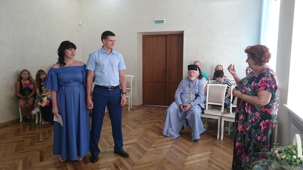 После проведения церемонии бракосочетания работниками ЗАГС, отец Михаил обратился ко всем присутствующим с речью в честь наступившего праздника Дня Крещения Руси: