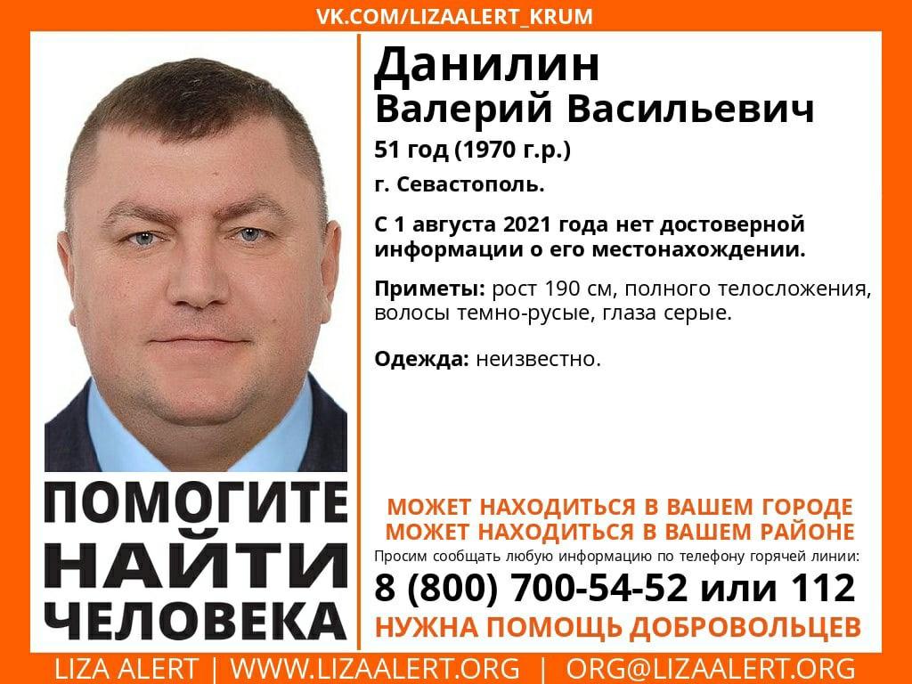 В Крыму без вести пропал Валерий Данилин, сообщает поисково-спасательный отряд «Лиза Алерт». С 1 августа нет достоверной информации о его местонахождении, он проживал в Севастополе. Приметы: рост 190 см, плотного телосложения, волосы темно-русые, глаза серые. Любую информацию о местонахождении пропавшего можно сообщить по номерам 8 (800) 700-54-52 или 112. Подписывайтесь на Кафу в Facebook, страницу ВКонтакте и группу в Одноклассниках. А также на канал Youtube и Telegram. Новости по теме
