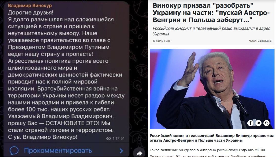 Винокур, который изначально призывал "разобрать Украину на части", внезапно изменил своё мнение. Интересно почему. Наверное его самого коснулись санкции и он понимает, что остаток своей жизни ему придётся проводить не в Париже, а в какой-то Сызрани.