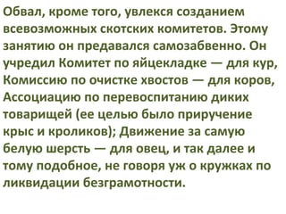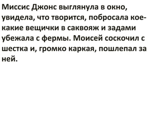"А вот опровергнуть выдумки, которые распускал ручной ворон Моисей, свиньям оказалось еще труднее. Моисей, любимец мистера Джонса, был ябедник и наушник, зато умел заговаривать зубы. Он уверял, что есть некий таинственный край, где текут молочные реки с кисельными берегами, туда после смерти отправятся все животные. Край этот, говорил Моисей, на небе, прямо за облаками. Там всю неделю, что ни день, воскресенье, круглый год не переводится клевер, а кусковой сахар и льняной жмых растут прямо на изгородях. Животные терпеть не могли Моисея: он плел небылицы и целый день бездельничал, но некоторые верили в молочные реки и кисельные берега, и свиньям стоило невероятных трудов убедить их, что такого края нет и в помине. Цитата из книги «Скотный Двор»