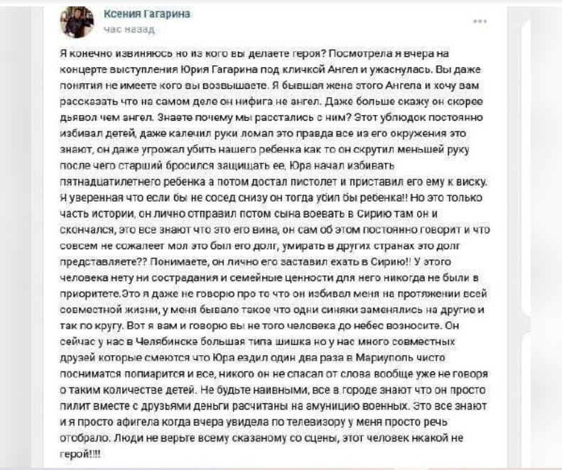 «Я конечно извиняюсь но из кого вы делаете героя? Посмотрела я вчера на концерте выступления Юрия Гагарина под кличкой Ангел и ужаснулась. Вы даже понятия не имеете кого вы возвышаете. Я бывшая жена этого Ангела и хочу вам рассказать что на самом деле он нифига не ангел. Даже больше скажу он скорее дьявол чем ангел. Знаете почему мы расстались с ним? Этот ублюдок постоянно избивал детей, даже калечил руки ломал это правда все из его окружения это знают, он даже угрожал убить нашего ребенка как то он скрутил меньшей руку после чего старший бросился защищать ее, Юра начал избивать пятнадцатилетнего ребенка а потом достал пистолет и приставил его ему к виску. Я уверенная что если бы не сосед снизу он тогда убил бы ребенка! Но это только часть истории, он лично отправил потом сына воевать в Сирию там он и скончался, это все знают что это его вина, он сам об этом постоянно говорит и что совсем не сожалеет мол это был его долг, умирать в других странах это долг представляете? Понимаете, он лично его заставил ехать в Сирию! У этого человека нету ни сострадания и семейные ценности для него никогда не были в приоритете.Это я даже не говорю про то что он избивал меня на протяжении всей совместной жизни, у меня бывало такое что одни синяки заменялись на другие и так по кругу. Вот я вам и говорю вы не того человека до небес возносите. Он сейчас у нас в Челябинске большая типа шишка но у нас много совместных друзей которые смеются что Юра ездил один два раза в Мариуполь чисто посниматся попиарится и все, никого он не спасал от слова вообще уже не говоря о таким количестве детей. Не будьте наивными, все в городе знают что он просто пилит вместе с друзьями деньги расчитаны на амуницию военных. Это все знают и я просто афигела когда вчера увидела по телевизору у меня просто речь отобрало. Люди не верьте всему сказаному со сцены, этот человек нкакой не герой!»