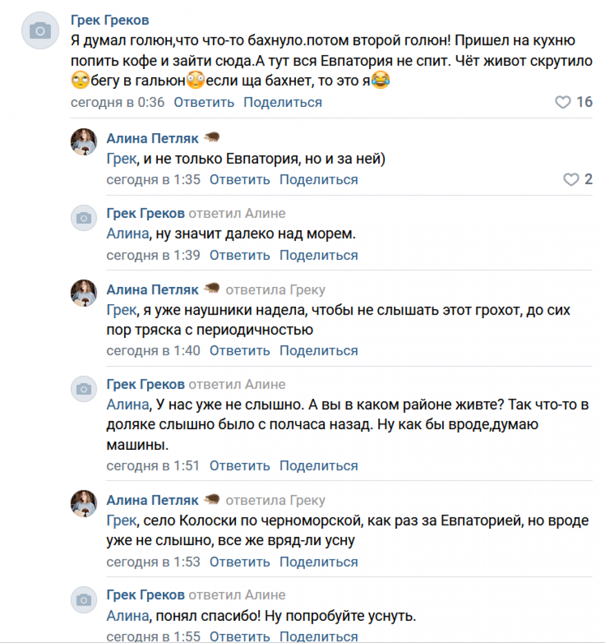 Также сообщают, что около 2.30 было от одного до трех взрывов в районе Евпатории. Их слышали также в селе Молочное в менее чем 10 километрах от города (тут также сообщают о якобы объявлении тревоги). О серии взрывов пишут и жители села Колоски на том же расстоянии от Евпатории.