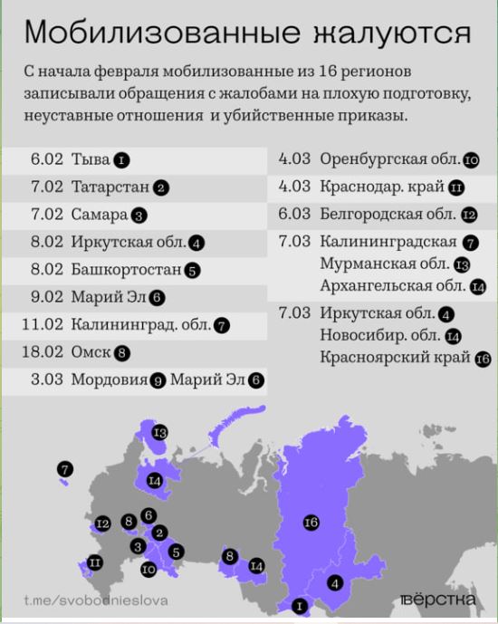 Мобилизованные резко увеличили число жалоб на своё положение на фронте. За месяц военнослужащие из 16 регионов записали видеообращения о плохой подготовке, отсутствии снаряжения и «мясных штурмах»