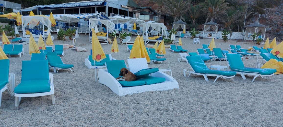 "На пляжах Турции много бродячих стай. Но отношение к собакам там не менее трепетное чем к кошкам. В Турции любую бродячую собаку можно погладить по голове, не боясь, что она в ответ от злости и испуга тебя укусит. Даже ту впервые встреченную собаку, с которой вы спрятались от дождя под случайным тентом. Повторять подобное в России не рекомендуется. В Турции вдоль набережной, пока шагаешь несколько километров от отеля до ближайшего городка, видишь ведерки с водой для бродячих собак. К моему удивлению, турецкие бездомные собачки выглядят сытыми. Они очень дружелюбные и спокойные, а на пляже могут залезть на лежак или плюхнуться на постеленное на берегу полотенце!
