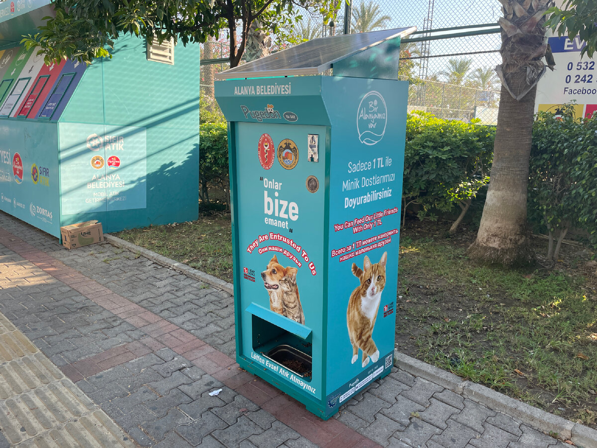На улицах Турции стоят автоматы с кормом для животных, представляете? Власти заботятся о бездомных животных и дают возможность подкармливать их быстро и просто: в автомат нужно положить 1 лиру (меньше 10 рублей), и порция корма выйдет из специального окошечка. Но также муниципальные службы каждый день сами наполняют кормушки едой и водой. По всей Аланье встречаются зоны для выгула собак, мусорки для уборки фекалий во время прогулки."