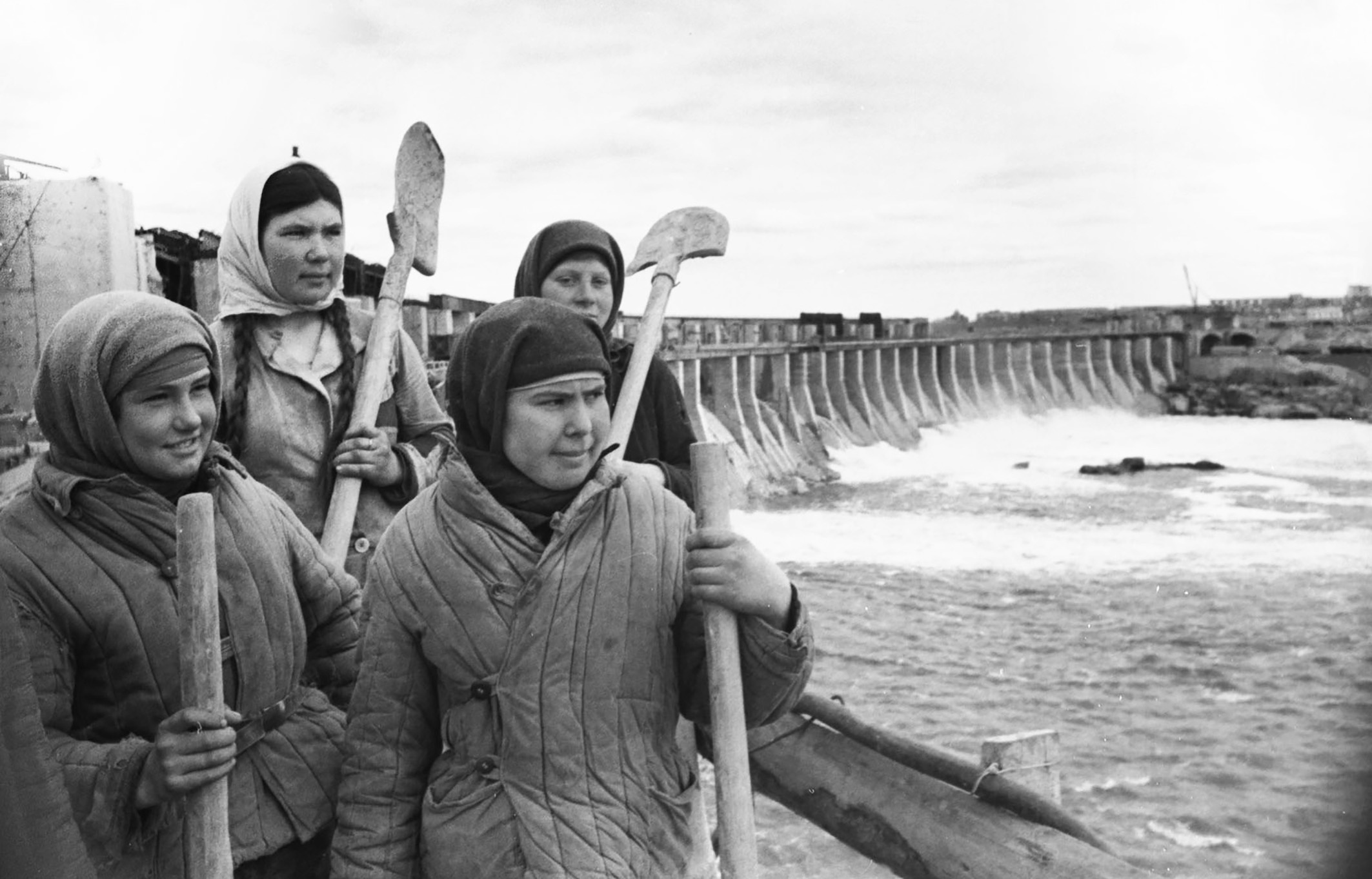 Колхозники и бетонщицы-стахановки на восстановлении ДнепроГЭСа, 1945 год.