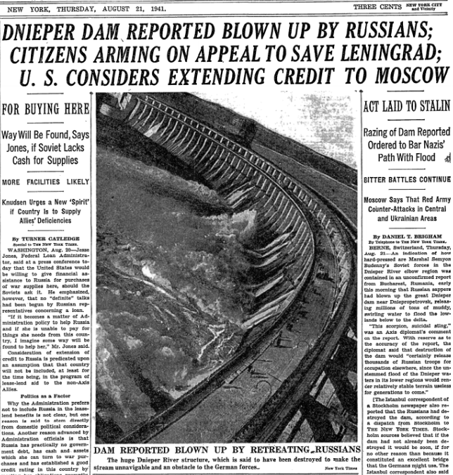 18 августа 1941 года, отступавшие советские войска вывели из строя Днепровскую ГЭС, а затем подорвали ее плотину.