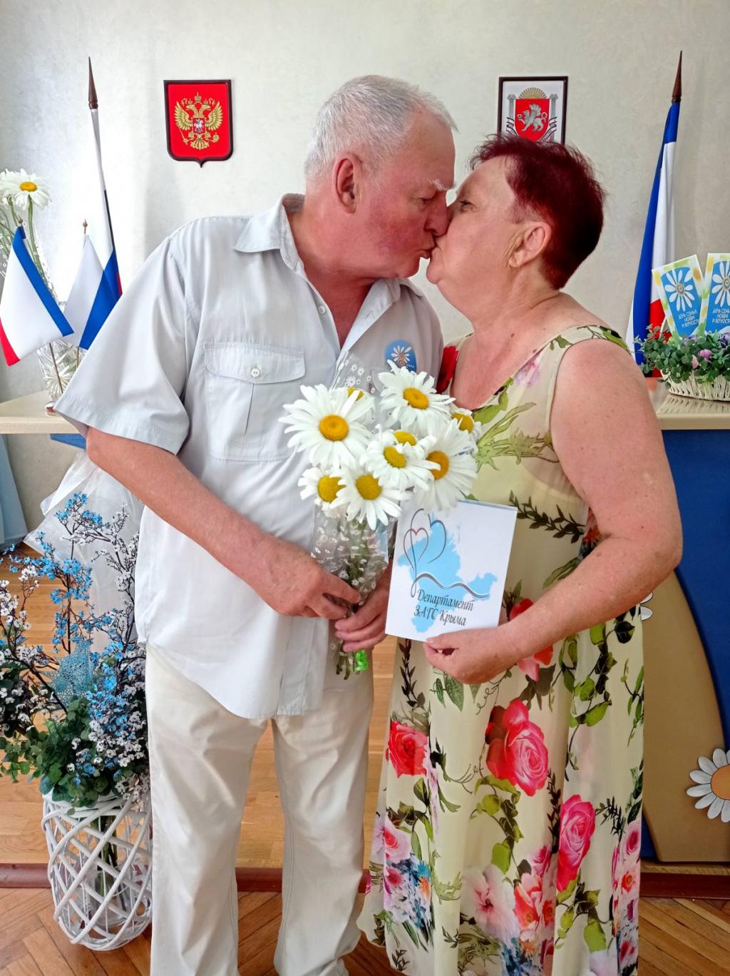 От имени Департамента ЗАГС работники отдела поздравили юбилейную пару и сказали спасибо за пример для молодых семей, вручили поздравительные открытки, подарки и, конечно же, ромашки.
