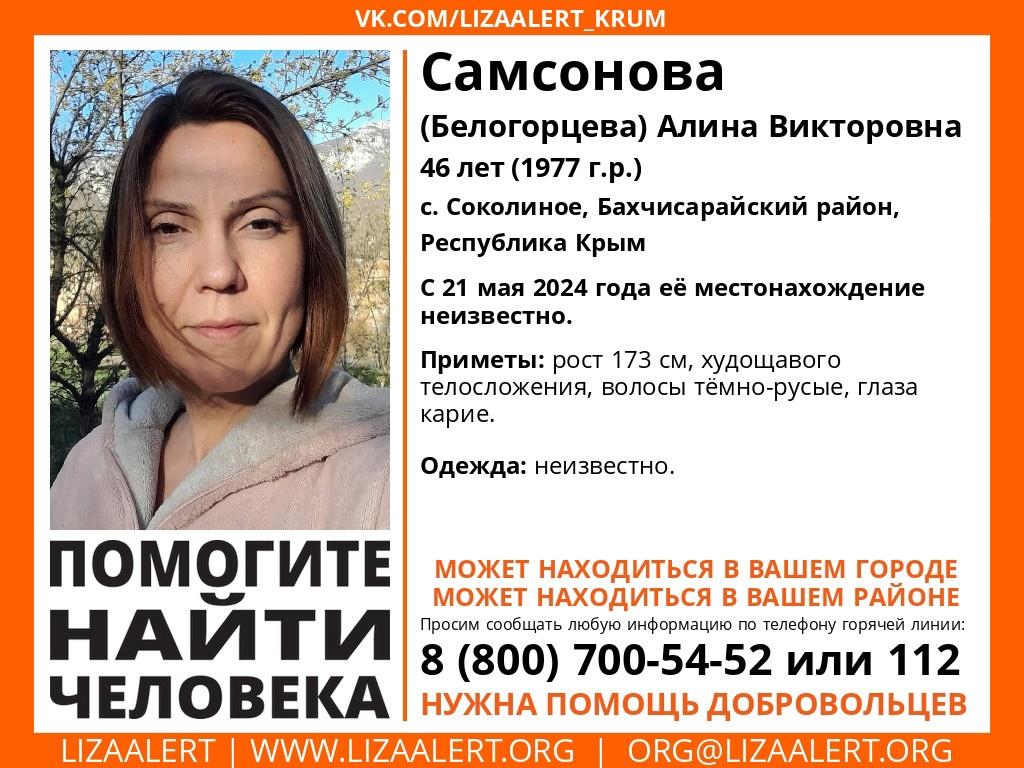 Поисково-спасательный отряда «ЛизаАлерт» сообщает: Пропала Алина Самсонова, ей 46 лет, проживала в Бахчисарайском районе. С 21 мая ее местонахождение неизвестно. Приметы: худощавого телосложения, рост 173 см, волосы темно-русые, глаза карие. Во что была одета - неизвестно. Всех, кто располагает информацией о пропавшей, просят сообщить по тел.: 8(800) 700-54-52 или 112. Подписывайтесь на Кафу в Facebook, страницу ВКонтакте и группу в Одноклассниках. А также на канал Youtube и Telegram. Новости по теме