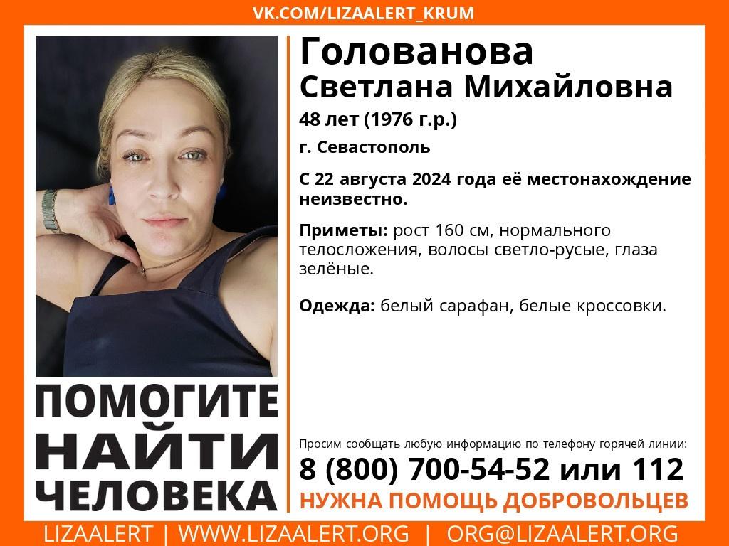 В Крыму разыскивают пропавшую женщину, сообщили в поисковом отряде «Лиза Алерт». Светлана Голованова, 48 лет, проживала в Севастополе, с 22 августа ее местонахождение неизвестно. Приметы: рост 160 сантиметров, нормального телосложения, волосы светло-русые, глаза зеленые. Была одета в белый сарафан и белые кроссовки. Тех, у кого есть информация о его местонахождении, просят позвонить 8-800-700-54-52 или 112. Подписывайтесь на Кафу в Facebook, страницу ВКонтакте и группу в Одноклассниках. А также на канал Youtube и Telegram. Новости по теме