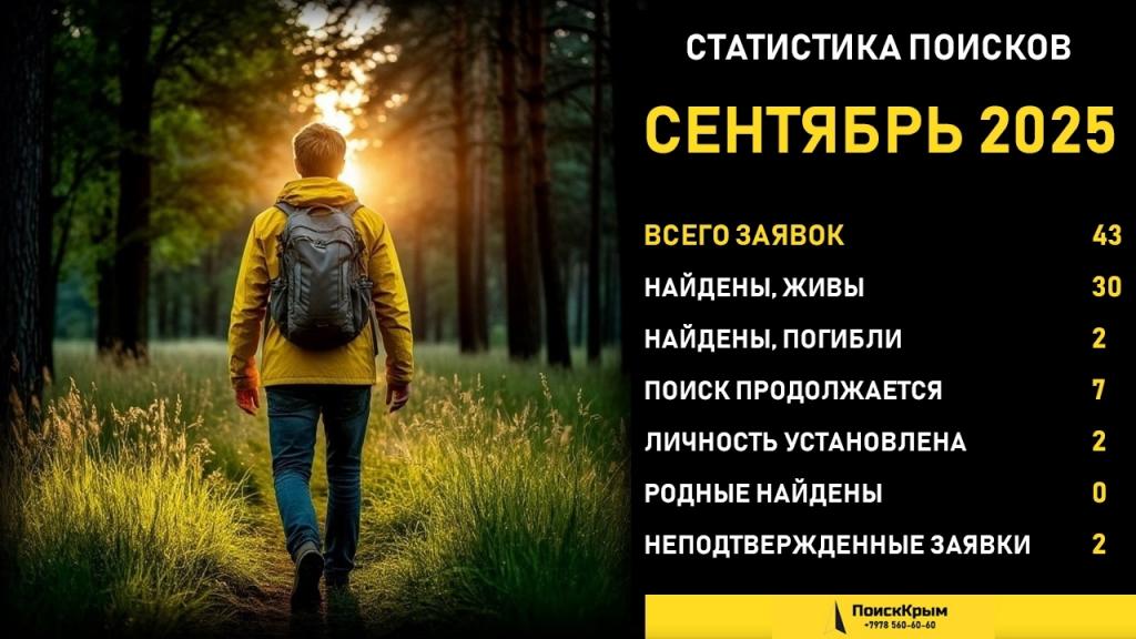 - Найдены погибшими двое, которые значились в списке без вести пропавших, - сообщили в отряде «ПоискКрым» статистику за ушедший сентябрь 2025 года. Семерых пропавших без вести пока не удалось разыскать. Родным, близким и друзьям не нужно отчаиваться – волонтеры и полиция делают все, чтобы прояснить их судьбу. Также в отряде «ПоискКрым» рассказали, что в начале осени больше всего поступило заявок на розыск людей в возрасте от 18 до 64 лет - 21 обращение, и старше 65 лет - 10 заявок. Исчезали из поля зрения близких 12 детей и подростков, не старше 17 лет.