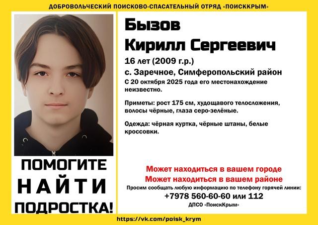 Пропал Кирилл Бызов, 16 лет (2009 г.р.) Просим сообщать любую информацию, связанную с поиском без вести пропавшего, по телефону горячей линии ПоискКрым +79785606060 Подписывайтесь на Кафу в Facebook, страницу ВКонтакте и группу в Одноклассниках. А также на канал Youtube и Telegram. Новости по теме