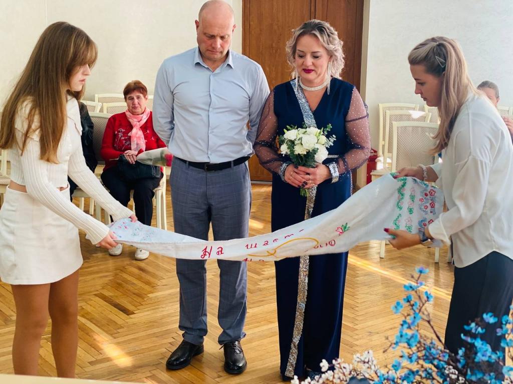В присутствии родных и близких, вступив на рушник согласия, юбиляры вновь обменялись кольцами и признались друг другу в любви. Поставив подписи в Книге памятных событий, супруги исполнили свадебный вальс. На память об этом дне им вручили поздравительный адрес и подарок.