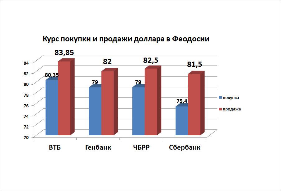 - в банке ВТБ (бывший РНКБ, ул. Земская) сегодня, 27 октября 2025 года, продать 1 доллар можно за 80,35 руб., купить - за 83,85 руб. Евро тут покупают по 94,80 руб., продают по 98,30 руб. Тут также есть курсы на фунт стерлингов, швейцарский франк, канадский доллар, японскую иену и китайский юань. - в Сбербанке (ул. Украинская) доллар у вас купят за 75,4 руб., продадут по 81,5 руб.; евро купят по 88,6 руб., продадут по 96,8 руб. В отделениях Сбербанка вы также можете сделать обмен рубля на китайский юань. - на сайте Генбанка (ул. Земская) сообщается, что доллар у вас купят за 79 руб., продадут по 82 руб., евро купят по 93,5 руб., продадут за 100,0 руб. На сайте также упоминается о возможности купить в банке золото в слитках, - от 1 до 100 граммов. Слиток в 1 грамм обойдется вам в 17,5тыс. руб. (за месяц цена выросла на 2,5 тыс. - 16%). - в банке ЧБРР (ул. Земская) доллар у вас купят за 79 руб., продадут по 82,5 руб.; евро купят по 93 руб., продадут по 97 руб. Напомним еще раз, что курсы валют есть, и продать доллары и евро тут можно. А вот купить - проблема, валюты обычно не бывает. Подписывайтесь на Кафу в Facebook, страницу ВКонтакте и группу в Одноклассниках. А также на канал Youtube и Telegram. Новости по теме