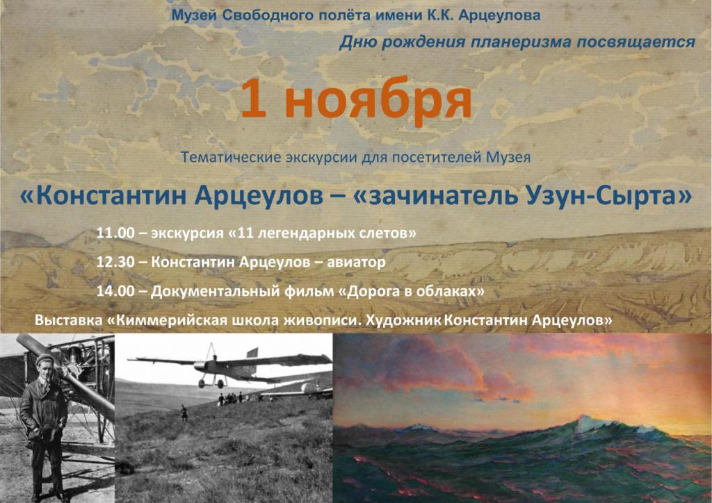 Закономерно имя Константина Арцеулова присвоено Музею Свободного полета в Феодосии. Расположен музей в историческом центре города, недалеко от галереи, и в своих залах представляет интересную экспозицию об истории планеризма. Наш музей рассказывает о летательных аппаратах, которые поднимаются в небо благодаря силе воздуха, силе восходящих потоков. Это - планеры, дельтапланы и парапланы. Их придумывают, создают, испытывают и соревнуются на них те самые смелые небесные романтики, живая история жизни которых представлена в фотографиях, газетных заметках и книгах. В музее есть редкие видео-хроники, документальные фильмы. Мы приглашаем вас совершить путешествие по стране Авиации и даже слетать в Космос, чтобы приземлиться в космическом амортизационном кресле «Казбек» аккурат рядом с нашим тренажером «Полет на дельтаплане».