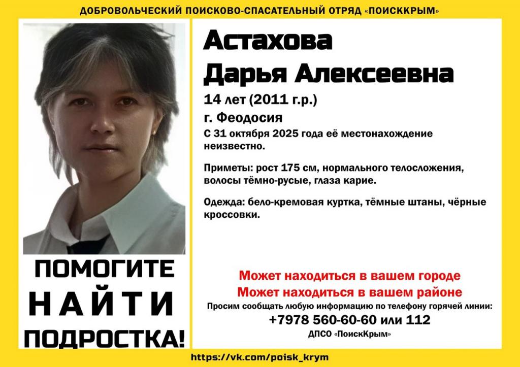 Пропала Дарья Астахова, 14 лет (2011 г.р.) Просим сообщать любую информацию, связанную с поиском без вести пропавшей, по телефону горячей линии ПоискКрым +79785606060 либо по номеру телефона+79788081498 (инфорг поиска Зейнеп) Подписывайтесь на Кафу в Facebook, страницу ВКонтакте и группу в Одноклассниках. А также на канал Youtube и Telegram. Новости по теме