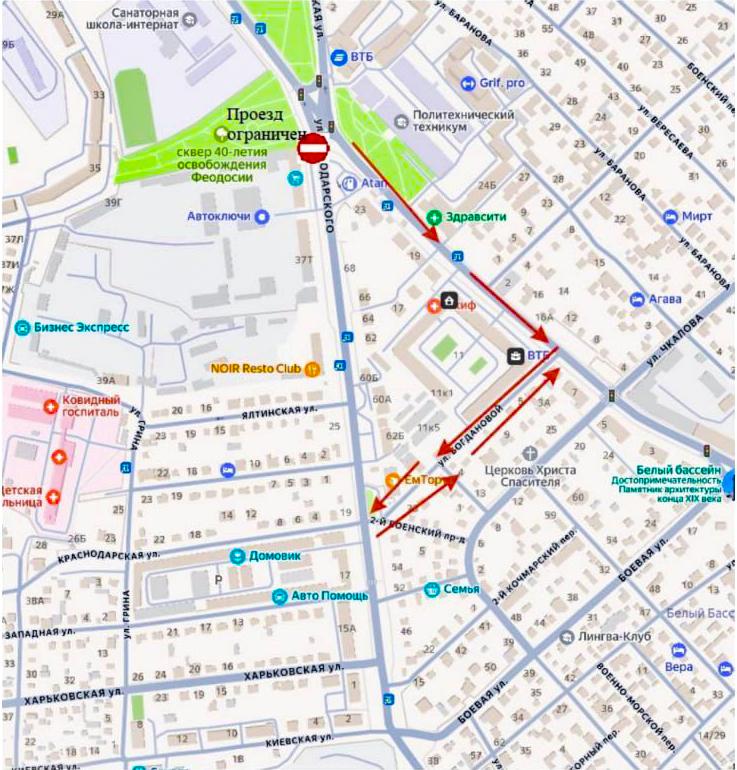 Движение будет перекрыто в районе магазина «Супермастер» и автозаправочной станции «Атан». Объезд можно будет произвести по ул. Володарского-ул. Богдановой-Симферопольскому шоссе, сообщает администрация Феодосии Подписывайтесь на Кафу в Facebook, страницу ВКонтакте и группу в Одноклассниках. А также на канал Youtube и Telegram. Новости по теме