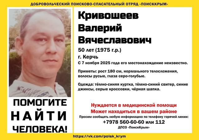 Пропал Валерий Кривошеев, 50 лет (1975 г.р.) Приметы: рост 180 см, телосложение нормальное. Волосы русые, глаза серо-голубые. Был одет в темно-синюю куртку, темно-синий свитер, синие джинсы, серые кроссовки и черную шапку. Просим сообщать любую информацию, связанную с поиском без вести пропавшего, по телефону горячей линии ПоискКрым +79785606060 Подписывайтесь на Кафу в Facebook, страницу ВКонтакте и группу в Одноклассниках. А также на канал Youtube и Telegram. Новости по теме