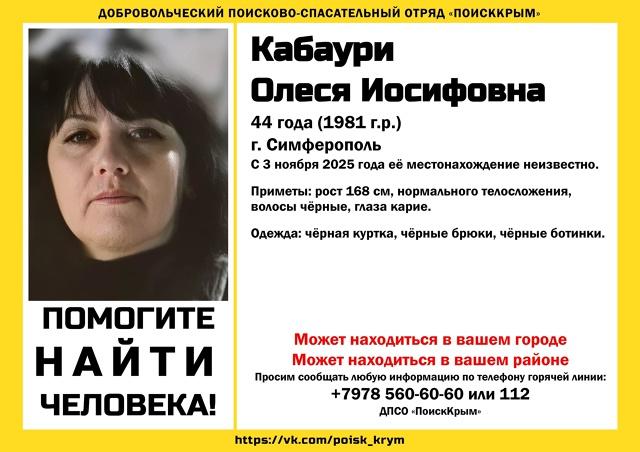 В Крыму разыскивают Олесю Кабаури. Как сообщают волонтеры "Поиск Крым", с 3 ноября о ее местонахождении ничего не известно. Приметы пропавшей: возраст: 44 года (1981 г.р.), рост 168 см, нормального телосложения, черные волосы, карие глаза. Была одета в черную куртку, черные брюки и черные ботинки. Пропавшая может находиться в Симферополе или другом населенном пункте Крыма. Любую информацию, которая может помочь в поисках Олеси Кабаури, просьба незамедлительно сообщать по телефонам: +7978 560-60-60, экстренная служба: 112 Подписывайтесь на Кафу в Facebook, страницу ВКонтакте и группу в Одноклассниках. А также на канал Youtube и Telegram. Новости по теме