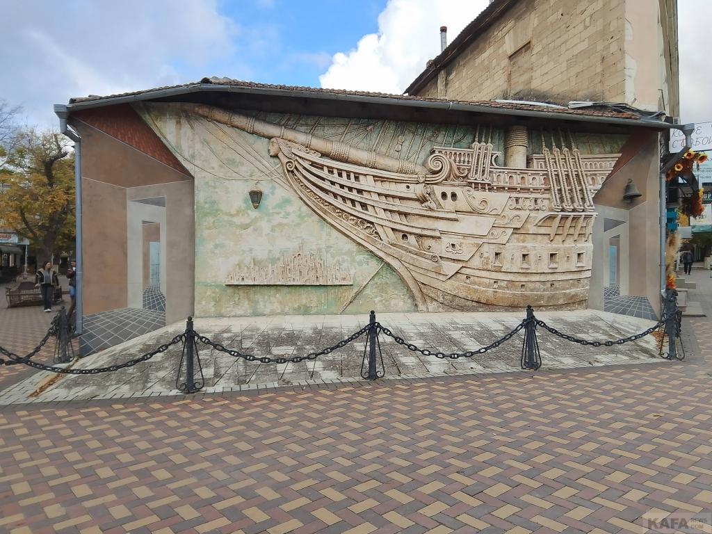 Стартуем от Музея Грина. Да, жаль, фонтан не работает. И смотрим под ноги: много плитки проваленной. А вот и Земская закончилась замечательным космическим памятником. Если бы не разбитые стекла того здания, что прежде был Телекомом за ним, - все отлично выглядело бы. Но мы уже на Адмиральском бульваре. Как тут хорошо! Да, немного почикали ветки у деревьев (но при этом немного пособирали мусор в Генуэзском рву). По левую руку школа №1 (очень хорошая школа!), а не дереве рядом с ней, сейчас в листве не видно, но скоро выглянут указатели: "До Генуи столько-то километров пешком". А помните, как нам грозили "обустроить" бульвар , переделав его полностью? Но обошлось... Больше об истории бульвара можно прочесть тут в "Кафе". Отдельно отметим вереницу замечательных рисунков на стене филиала Крымского университета, - стоит посмотреть. И вот уже мы на перекрестке Бульвара и ул. Армянской, - тут нас ждет Храм Михаила и Гавриила, увы, продолжает разрушаться. Если бы мы с вами пошли вверх, то вышли бы к Митридату, - но это потом, обязательно сходим. А пока мы идем по улице Армянской, и вот мы уже у могилы Айвазовского, - это у храма Сурб-Саркис. Храм чудесен, парк при нем ухожен, и сколько там котиков...