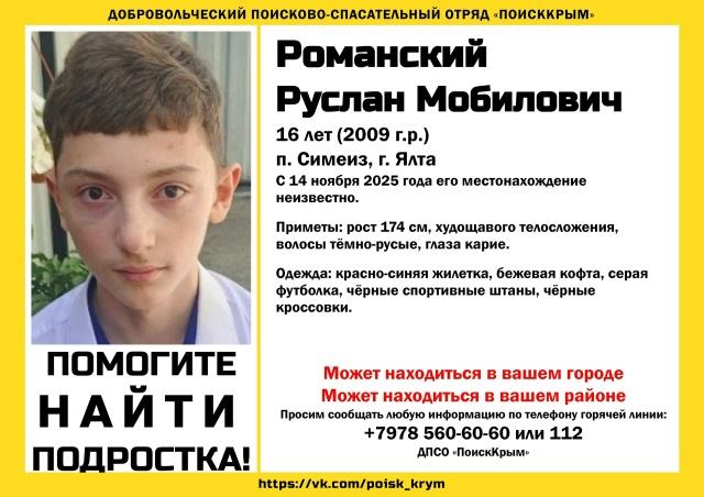 В Симеизе пропал 16-летний Руслан Романский, сообщает «ПоискКрым». С 14 ноября его местонахождение неизвестно. Приметы: рост 174 см, телосложение худощавое, волосы темно-русые, глаза карие. Был одет в красно-синюю жилетку, бежевую кофту, серую футболку, черные спортивные штаны и черные кроссовки. Любую информацию, связанную с поиском без вести пропавшего, просят сообщать по телефону горячей линии #ПоискКрым +79785606060 либо по номеру телефона+79788081498 (инфорг поиска Зейнеп). Подписывайтесь на Кафу в Facebook, страницу ВКонтакте и группу в Одноклассниках. А также на канал Youtube и Telegram. Новости по теме