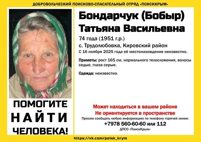 В селе Трудолюбовка пропала 74-летняя Татьяна Бондарчук, сообщает «ПоискКрым». С 16 ноября ее местонахождение неизвестно. Приметы: рост 165 см, телосложение нормальное, волосы седые, глаза серые. Любую информацию, связанную с поиском без вести пропавшей, просят сообщать по телефону горячей линии ПоискКрым +79785606060 или по номеру телефона +79788081498 (инфорг поиска Зейнеп). Подписывайтесь на Кафу в Facebook, страницу ВКонтакте и группу в Одноклассниках. А также на канал Youtube и Telegram. Новости по теме