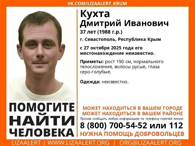 Волонтеры отряда «ЛизаАлерт» Крым ведут поиски исчезнувшего: «Пропал Дмитрий Кухта , 37 лет, проживал в Севастополе». Близкие уже несколько недель ничего не знают о судьбе мужчины - с 27 октября его местонахождение неизвестно. Приметы исчезнувшего: 190 см. рост, нормальное телосложения, русые волосы, серо-голубые глаза. Любую информацию о местонахождении пропавших нужно сообщать на «горячую» линию отряда «ЛизаАлерт»: 8 (800) 700-54-52. Звонки бесплатные.