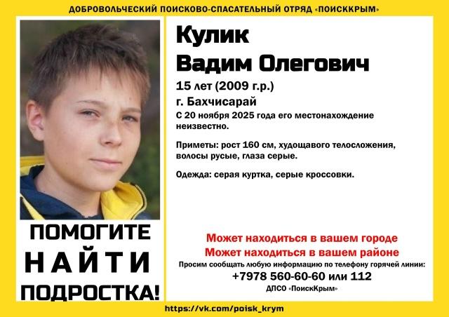 Волонтеры отряда «ПоискКрым» бьют тревогу: пропал Вадим Кулик, 15 лет (2009 г.р.), проживал в Бахчисарае. Родные и близкие потеряли подростка из вида два дня тому назад, с 20 ноября его местонахождение неизвестно. Приметы Вадима Кулика: 160 см рост, худенький, русые волосы, серые глаза. Волонтеры просят сообщать любую информацию, связанную с поиском без вести пропавших, на «горячую линию» добровольческого поисково-спасательного отряда «ПоискКрым»: +7 (978) 560 60 60.