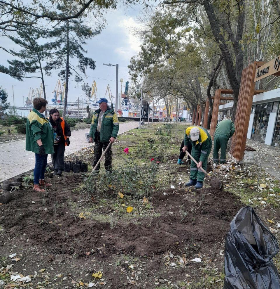 Бригада озеленителей «Городского благоустройства» активно работает, проводя высадку роз в разных районах Феодосии.