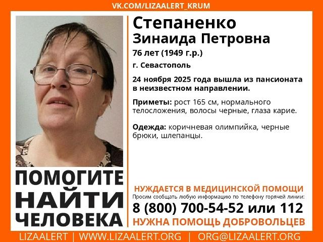 Волонтеры отряда «ЛизаАлерт» Крым разместили в соцсети ориентировку на пожилую женщину: «Внимание! Помогите найти человека! Пропала Зинаида Степаненко, 76 лет, город Севастополь». Пенсионерка исчезла накануне, 24 ноября она вышла из пансионата в неизвестном направлении. Приметы без вести пропавшей: 165 см. рост, нормальное телосложение, черные волосы, карие глаза. Пенсионерка была одета в коричневую олимпийку, черные брюки, обута в шлепанцы. Информацию о местонахождении пропавших просят сообщать по телефону: 8 (800) 700-54-52 или 112.