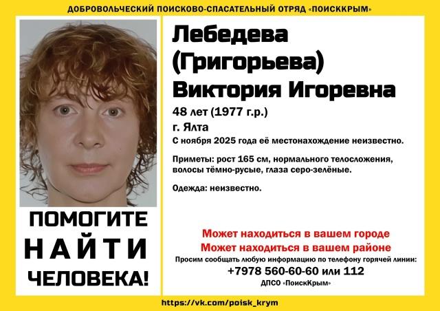 Пропала Виктория Лебедева, 48 лет (1977 г.р.) Приметы: рост 165 см, нормального телосложения, волосы темно-русые, глаза серо-зеленые. В чем была одета - неизвестно. Просим сообщать любую информацию, связанную с поиском без вести пропавшей, по телефону горячей линии #ПоискКрым +79785606060 Подписывайтесь на Кафу в Facebook, страницу ВКонтакте и группу в Одноклассниках. А также на канал Youtube и Telegram. Новости по теме