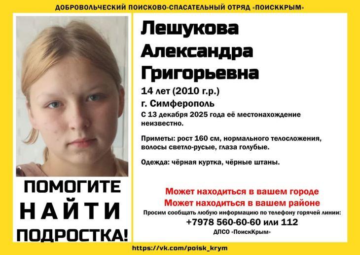 В Крыму продолжаются поиски сразу трех несовершеннолетних, которые пропали в Симферополе. С 13 декабря их местонахождение неизвестно. Лешукова Александра, 14 лет (2010 г.р.) По информации добровольческого поисково-спасательного отряда «ПоискКрым», подростки могут находиться как в Симферополе, так и за его пределами. Поиск продолжается, к нему привлечены волонтёры. * на горячую линию ДПСО «ПоискКрым»: +7 (978) 560-60-60 Подписывайтесь на Кафу в Facebook, страницу ВКонтакте и группу в Одноклассниках. А также на канал Youtube и Telegram. Новости по теме