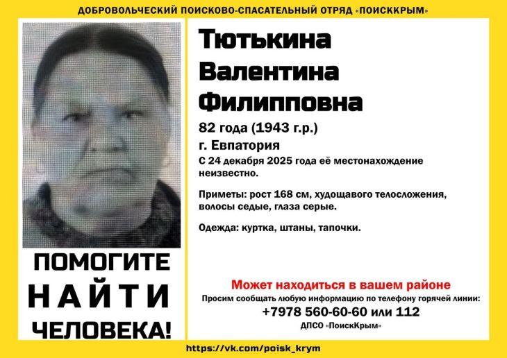В Евпатории ищут 82-летнюю Валентину Тютькину. Женщина ушла из дома 24 декабря и не вернулась, поиски волонтеров результатов не дали, сообщили в добровольческом поисково-спасательном отряде ПоискКрым». Приметы пропавшей: 168 сантиметров, худощавого телосложения, волосы седые, глаза серые. На момент пропажи была одета в куртку, штаны и тапочки. Любую информацию, связанную с поиском без вести пропавшей, можно сообщить по телефону горячей линии +79785606060 или 112. Подписывайтесь на Кафу в Facebook, страницу ВКонтакте и группу в Одноклассниках. А также на канал Youtube и Telegram. Новости по теме