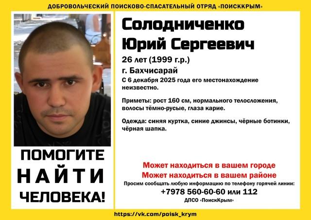 Волонтерский отряд «ПоискКрым» в социальных сетях распространяет ориентировку о розыске молодого человека. «Житель Бахчисарая Юрий Солодниченко, 1999 года рождения (26 лет), пропал 6 декабря 2025 года», - сообщают поисковики. Приметы разыскиваемого: рост около 160 сантиметров, телосложение обычное, волосы темно-русого цвета, глаза карие. В день исчезновения на нем была синяя куртка, джинсы, черные ботинки и черная шапка. Любые сведения, которые могут помочь в установлении места нахождения Юрия, просьба сообщать по контактному телефону поискового отряда «ПоискКрым»: +7(978) 56 06 060. Подписывайтесь на Кафу в Facebook, страницу ВКонтакте и группу в Одноклассниках. А также на канал Youtube и Telegram. Новости по теме