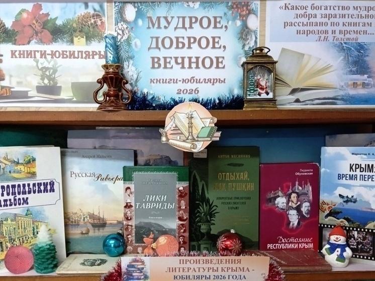 В симферопольской библиотеке им. Коцюбинского открылась выставка «Мудрое, доброе, вечное. Книги-юбиляры – 2026», посвященная книгам-юбилярам наступившего года. Экспозиция включает как классические произведения русской литературы, так и краеведческие издания о Крыме. Первый раздел выставки сотрудники библиотеки посвятили краеведческой литературе, разместив на книжной полке крымские издания-юбиляры, в числе которых: сборники стихотворений крымских поэтов-фронтовиков, изданных в «Крымиздате» в 1956 году «Именем поколения» Бориса Сермана и «Горный ключ» Анатолия Милявского, «Симферопольский альбом», выпущенный издательством «Таврия» 30 лет назад в честь 75-летия самого издательства, книга Елены Криштоф «Люди, которых я люблю», изданная в 1986 году. 20 лет отмечают краеведческие изыскания Галины Печаткиной в двух книгах «Лики Тавриды», в которые вошли очерки, воспоминания и эссе о выдающихся людях, бывавших и живших в Крыму. 10 лет назад в Симферополе вышла в свет книга вторая литературно-публицистического издания Людмилы Обуховской «Достояние Республики». И совсем «юный» юбиляр на полке краеведческих изданий – книга 2021 года «Отдыхай, как Пушкин. Невероятные приключения писателей в Крыму» Антона Меснянко, собравшая истории о писателях и поэтах, которые в свое время бывали в Крыму. Второй раздел выставки знакомит читателей с юбилеями классиков русской литературы. В этом году отмечаются: