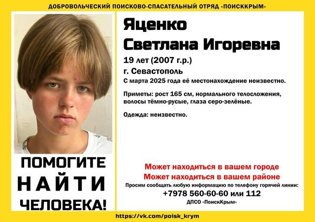Пропала Светлана Яценко, 19 лет, (2007 г.р.) Приметы: рост 165 см, нормально телосложения, волосы темно-русые, глаза серо-зеленые. Просим сообщать любую информацию, связанную с поиском без вести пропавшей, по телефону горячей линии ПоискКрым +79785606060 Подписывайтесь на Кафу в Facebook, страницу ВКонтакте и группу в Одноклассниках. А также на канал Youtube и Telegram. Новости по теме