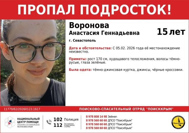 Пропала Анастасия Воронова, 15 лет (2010 г.р.) Приметы: рост 170 см, худощавого телосложения, волосы темно-русые, глаза зеленые. Просим сообщать любую информацию, связанную с поиском без вести пропавшей, по телефону горячей линии #ПоискКрым +79785606060 Подписывайтесь на Кафу в Facebook, страницу ВКонтакте и группу в Одноклассниках. А также на канал Youtube и Telegram. Новости по теме