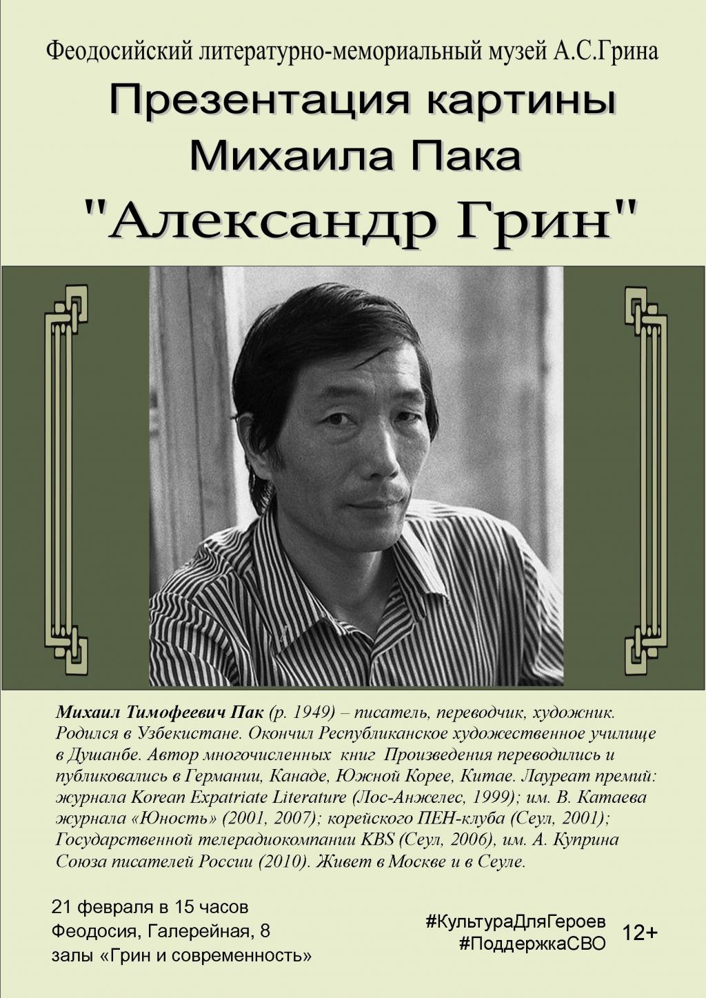 Михаил Тимофеевич Пак - известный художник, литератор, переводчик. Лауреат литературных премий им. В. Катаева, А.Куприна. Он обладает насыщенной творческой биографией. Родился в 1949 году в Ташкентской области Узбекистана. В 1970 году окончил художественное училище в Душанбе (Таджикистан), а после его окончания жил и трудился в Казахстане. В 1998 году судьба привела Михаила Тимофеевича в Москву. С 1988 года является членом Союза писателей, а с 1999 года - Союза художников . Художественные выставки успешно экспонировались в России, Италии, Бельгии, Франции и других странах. Приглашаем на презентацию картины Михаила Пака "Александр Грин" в субботу, 21 февраля, в 15:00. Вход свободный! Подписывайтесь на Кафу в Facebook, страницу ВКонтакте и группу в Одноклассниках. А также на канал Youtube и Telegram. Новости по теме