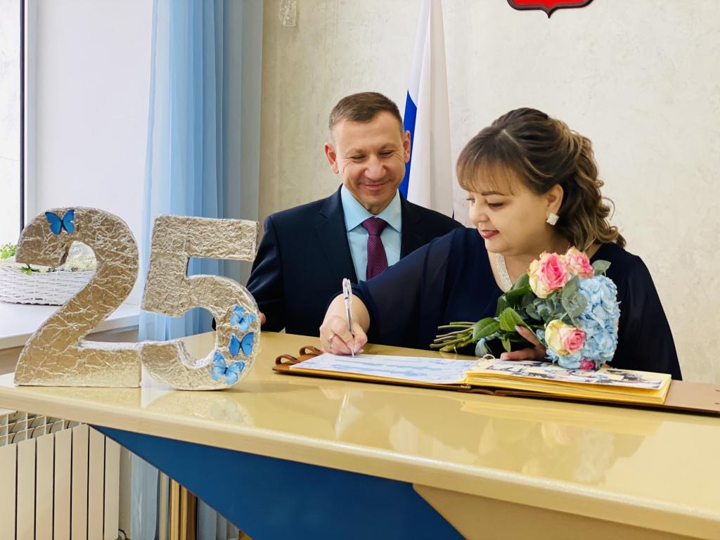 Сотрудники отдела ЗАГС торжественно поздравили супругов с Серебряным юбилеем совместной жизни: «Ваша семья — это настоящее сокровище, которое вы бережно храните на протяжении 25-ти лет. Сегодня мы хотим пожелать вам еще много лет счастья и радости вместе. Храните свою любовь, цените и оберегайте друг друга. Пусть ваша жизнь будет наполнена яркими моментами, приятными сюрпризами и радостными событиями. А ваша любовь будет такой же крепкой, как этот благородный металл!».