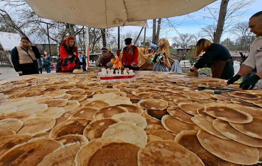 На Масленицу в Бахчисарайском парке миниатюр в Крыму мастера создали самый большой блин в Крыму. Его диаметр составил 3,5 метра. На изготовление этого гигантского блина ушло более 800 обычных блинчиков, которые пекли на протяжении двух суток. «Мы устроили праздник для детворы и взрослых, наши мастера-повара испекли более 800 блинов, выложив их на специальной подложке, общий диаметр составил 3,5 метра», — сообщила организатор мероприятия Ольга Смирная. Иван Нещеретный, шеф-повар крымских ресторанов, поделился информацией о том, что для приготовления блинов было использовано 30 кг муки, 20 литров молока, 200 яиц, и на весь процесс ушло двое суток непрерывной работы у плиты. Это рекордное количество блинов, когда-либо приготовленных за один раз в рамках празднования в Крыму. Сцена, где развернулись масленичные гуляния, была украшена атрибутами праздника: соломенными чучелами, самоваром и баранками. На празднике гости катались с горки на надувных санях, наблюдали за выступлениями творческих коллективов и провожали зиму. Завершилось все чаепитием с блинами. Подписывайтесь на Кафу в Facebook, страницу ВКонтакте и группу в Одноклассниках. А также на канал Youtube и Telegram. Новости по теме