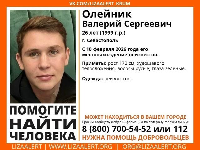 Добровольцы поискового «ЛизаАлерт» Крым распространили информацию об исчезновении жителя Севастополя. Разыскивается 26-летний Валерий Олейник (1999 г.р.). Две недели – с 10 февраля 2026 года о местонахождении его ничего не известно. Приметы разыскиваемого: рост 170 см, худощавое телосложение, волосы русые и глаза зеленые. Информация о том, во что был одет пропавший на момент исчезновения, отсутствует. Волонтеры обращаются ко всем, кто может обладать сведениями, способными помочь в установлении места нахождения Валерия, с просьбой позвонить на круглосуточный номер горячей линии отряда «ЛизаАлерт» Крым: 8 (800) 700-54-52 или по единому номеру экстренных служб 112.