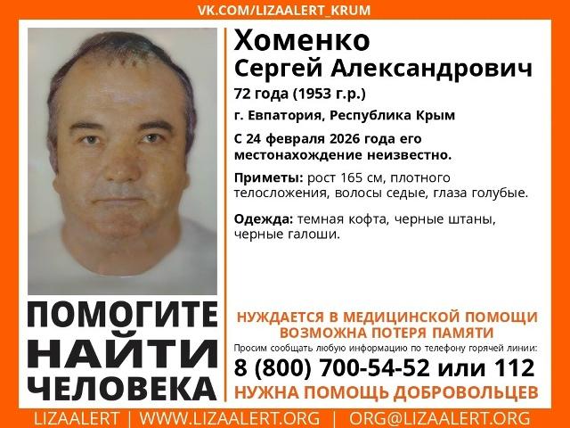 Волонтеры отряда «ЛизаАлерт» Крым сообщили об исчезновении пожилого человека: Пропал Сергей Хоменко Александрович, 72 года, проживал в Евпатории. Он исчез накануне, с 24 февраля его местонахождение неизвестно. Приметы: рост 165 см, плотного телосложение, седые волосы, голубые глаза. Был одет в темную кофту, черные штаны и обут в черные галоши. Поисковики просят любую информацию, которая поможет его найти, сообщать на «горячий» телефон отряда «ЛизаАлерт» Крым: 8 (800) 700-54-52 или 112.
