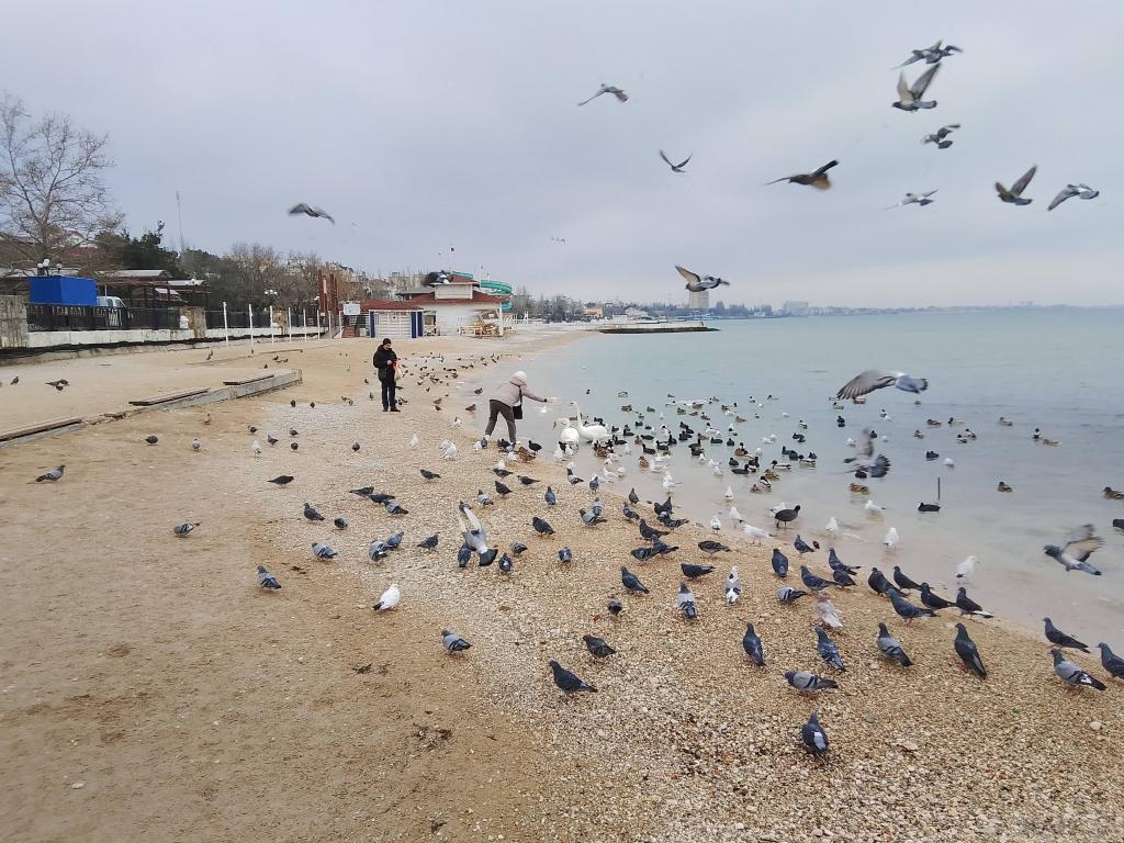 Солнце показалось из-за горизонта точно по расписанию: в 7:16. С утра еще подмораживает, но днем уже будет +8, а завтра обещают +11: весна пришла! На улицах много дворников, у почты дежурит стая собак, еще одна стая бегает по набережной среди обломков плитки и гранита. В заливе много чаек и уток, а вот лебедей нет, - или улетели уже, или на озерах отдыхают.