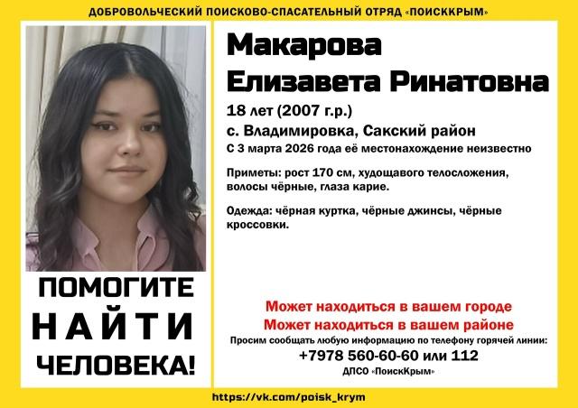 Пропала Елизавета Макарова, 18 лет (2007 г.р.) Приметы: рост 170 см, худощавого телосложения, волосы черные, глаза карие. На ней были черная куртка и черные брюки. Просим сообщать любую информацию, связанную с поиском без вести пропавшей по телефону горячей линии ПоискКрым +79785606060 Подписывайтесь на Кафу в Facebook, страницу ВКонтакте и группу в Одноклассниках. А также на канал Youtube и Telegram. Новости по теме