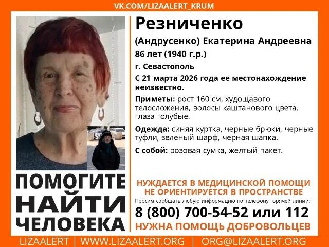 Пропала Екатерина Резниченко, 86 лет. Приметы: рост 160 см, худощавого телосложения, волосы каштановые, глаза голубые. Была одета: синяя куртка, черные брюки, черная шапка, в руках была розовая сумка. Если вы что-то знаете о ее местонахождении, позвоните: 89788182979 или 112 Подписывайтесь на Кафу в Facebook, страницу ВКонтакте и группу в Одноклассниках. А также на канал Youtube и Telegram. Новости по теме