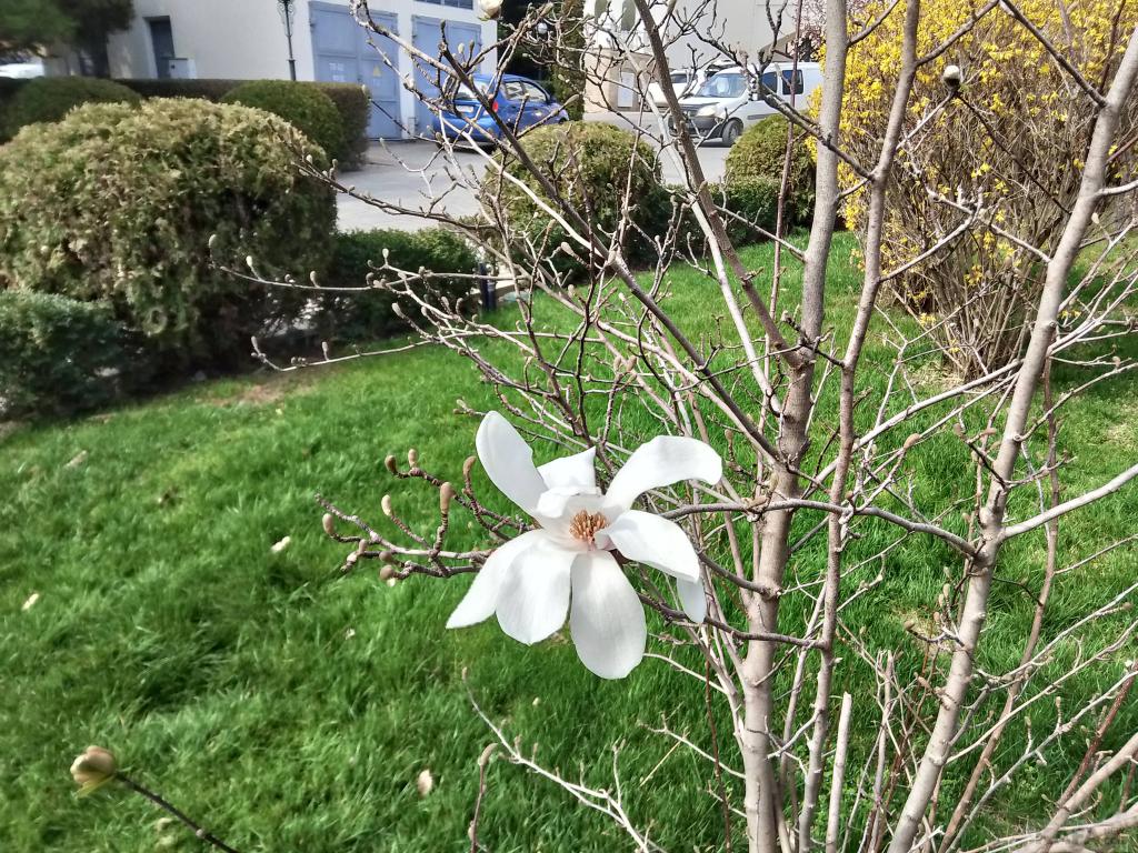 Магнолий в этом городском сквере прежде было больше, но сейчас радует нас одна. Впрочем, там много и других замечательных цветов, не проходите мимо!