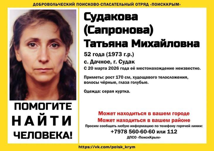Объявлен поиск без вести пропавшей 52-летней Татьяны Судаковой, жительницы села Дачное (Судак). По информации поисково-спасательного отряда «ПоискКрым», с 20 марта местонахождение женщины остается неизвестным. Приметы пропавшей: рост 170 см, худощавое телосложение, черные волосы, голубые глаза. На момент исчезновения была одета в серую куртку. Волонтеры отмечают, что женщина может находиться в любом городе или районе региона. Всех, кто располагает какой-либо информацией о возможном местонахождении Татьяны Судаковой, просят незамедлительно сообщить по телефонам горячей линии: Подписывайтесь на Кафу в Facebook, страницу ВКонтакте и группу в Одноклассниках. А также на канал Youtube и Telegram. Новости по теме