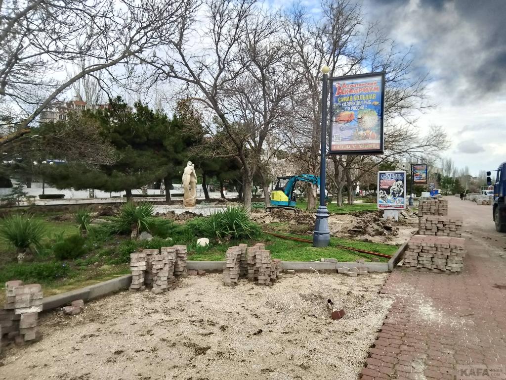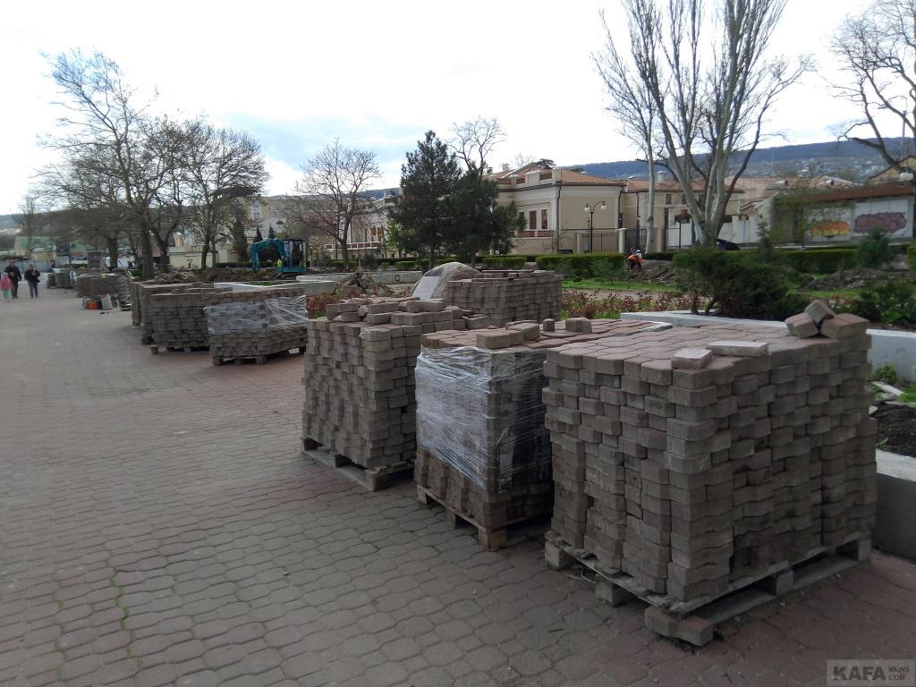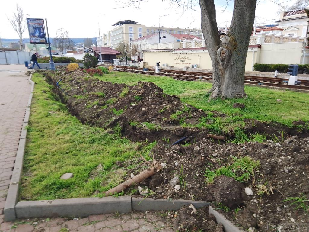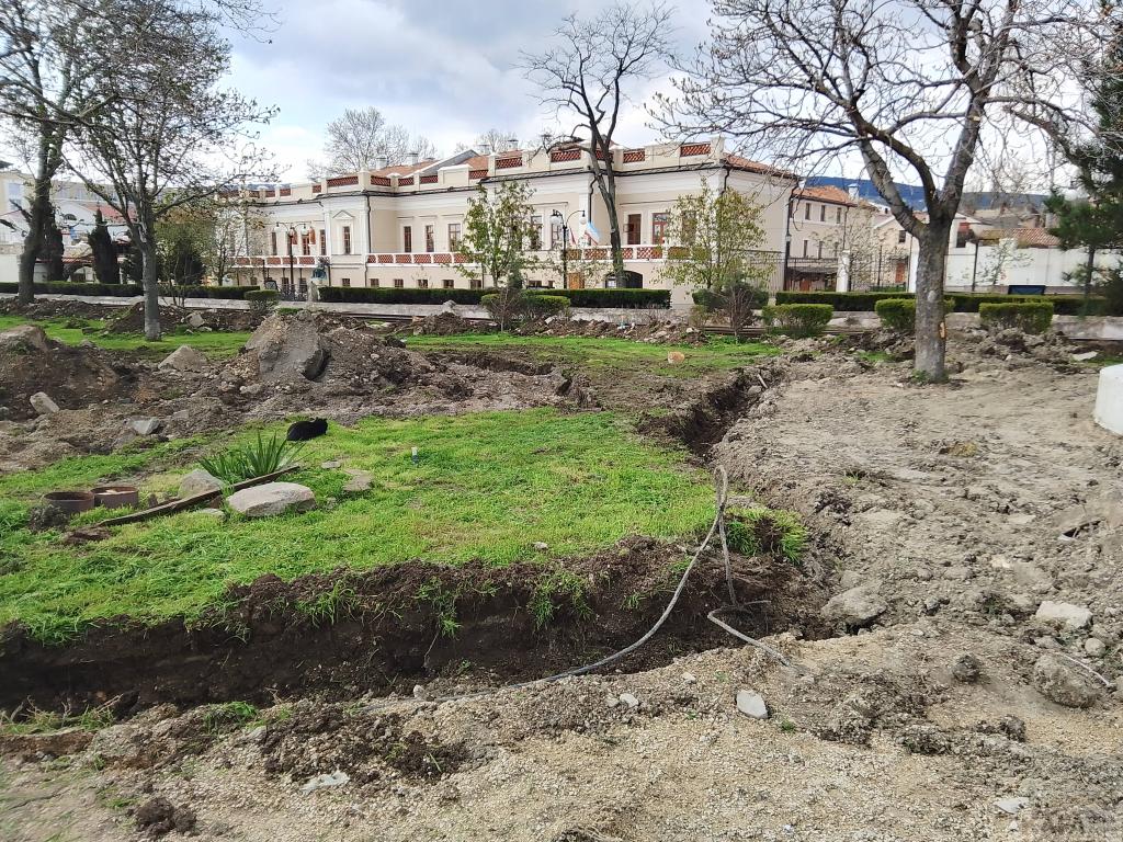 Пока идет только демонтаж: плитку теперь снимают и у зеленой зоны. Фонари и навесы все сняты и вывезены, скамеек нет, фонтаны разобраны. Сейчас роют глубокие канавы на газонах, по словам рабочих, там будут устанавливать новые бордюры. Тем самым, ширина набережной увеличится. В социальных сетях активно обсуждают, сколько же поставят кафе-магазинчиков в зеленой зоне набережной: шесть или восемь. Была информация в соцсетях же о том, что 21 апреля администрация Феодосии проведет конкурс на аренду мест под эти торговые заведения, была даже ссылка на сайт администрации, но потом эта страница с сайта пропала. Значит, нам знать и не нужно, а может, это был фейк. Снова прорыли слив у ливневки, - она после дождей размахнулась водой и запахом. Много мусора, как на набережной (что понятно, стройка же идет), так и на пляже, его периодически убирают. Зато в кафе "Веранда" музыка играет, - этим все ни по чем. Напомним, по на паспорте объекта, установленном на входе на набережную, указан срок завершения работ 1.09.2026, но администрация Феодосии рассчитывает, что получится к Дню города